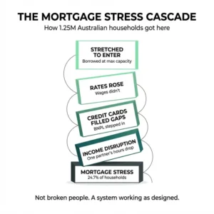 They stretched to enter the market because everyone said “get in now or you’ll be locked out forever.” They borrowed at the top of their capacity because property “always goes up.” Then rates rose. Costs rose. Wages didn’t.
